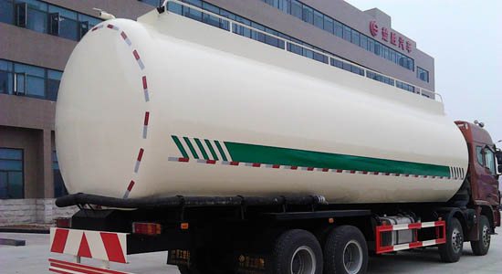 罐體有效容積35立方米.罐體外形尺寸:直段長:8400mm,直徑:2500mm.運輸介質(zhì)煙煤粉,密度0.4噸/立方米.選裝同系列高頂駕駛室,同時平頂,高頂駕駛室選裝無側(cè)風(fēng)窗及遮陽罩.側(cè)面及后下部防護(hù)裝置所用材料為Q235、連接方式為螺栓連接.后部防護(hù)裝置的斷面寬和高為100mm×100mm,下邊緣的最大離地高度為476mm.