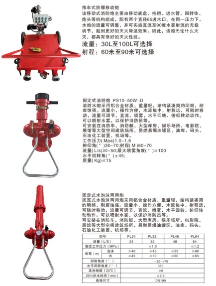 消防水炮采用鋁合金材質(zhì),重量輕,結(jié)構(gòu)緊湊簡約明朗,耐腐蝕強。流量小,操作方便,水流集中,射程遠,可隨時移動,流量可調(diào)節(jié)、直流、噴霧,水平回轉(zhuǎn)、俯仰轉(zhuǎn)動動作?以噴射水霧,以保護消防員等。 可安裝在消防車、消防艇、大型庫房、娛樂場所、電影院、展館等大型空間建筑場所,易燃易爆油罐區(qū)、油庫、碼頭、石油化工裝置、機場等。 工作壓力(Mpa)1.0-1.6